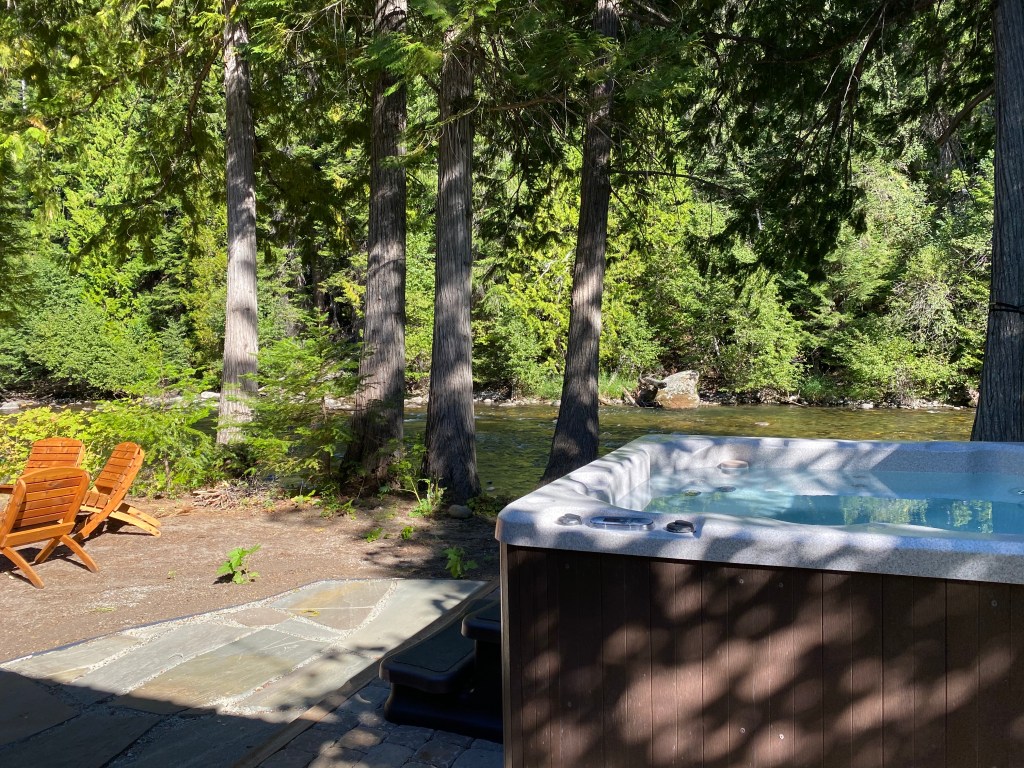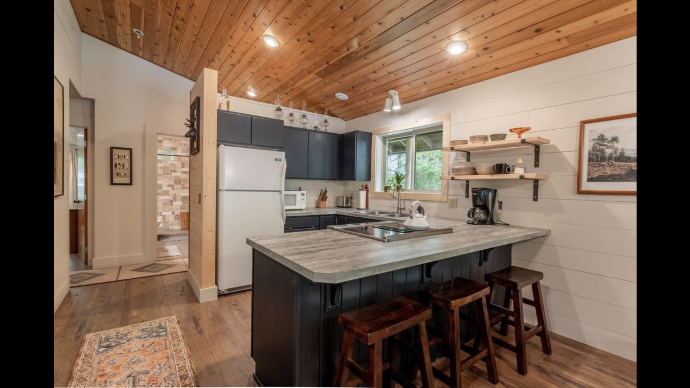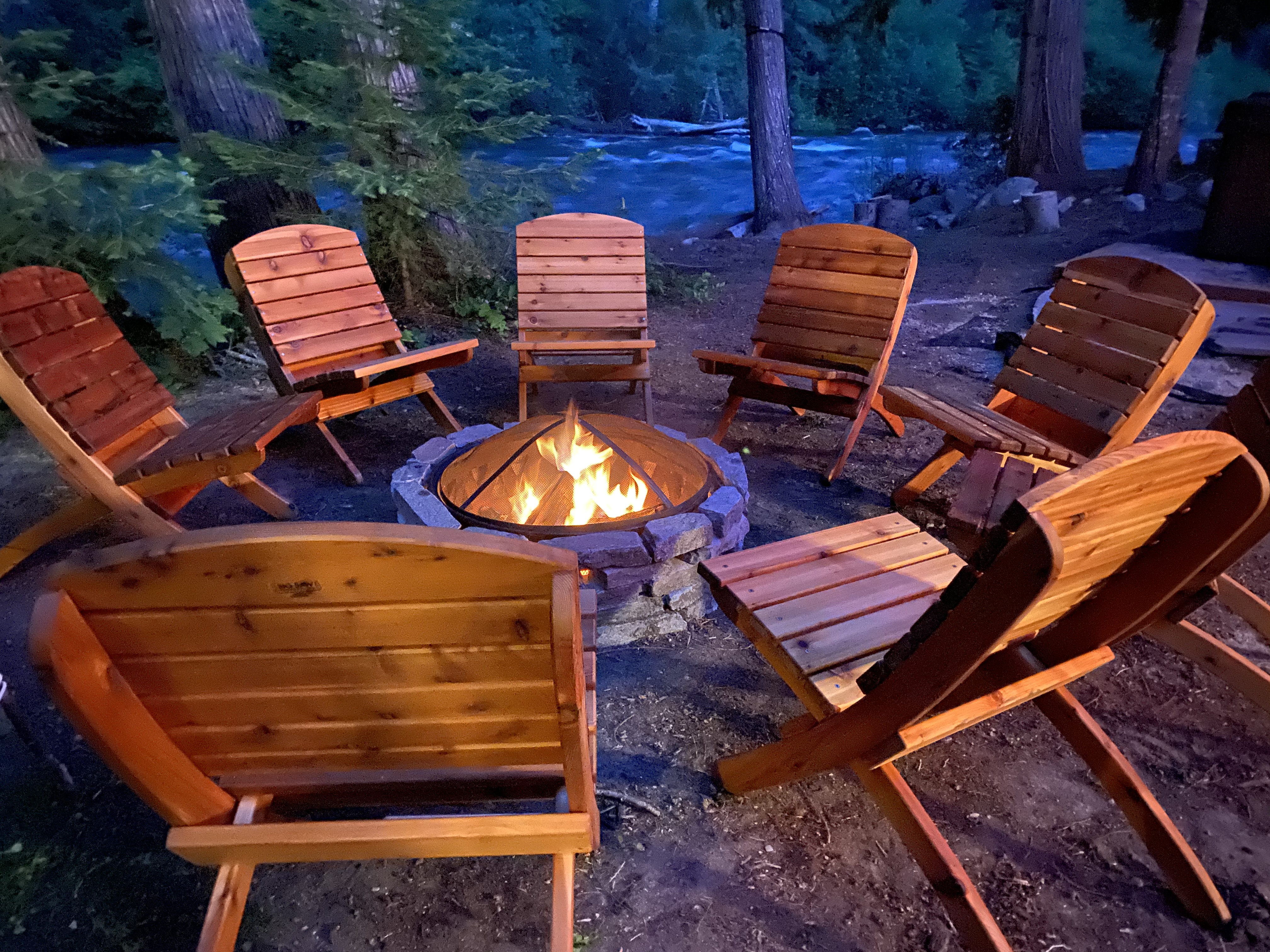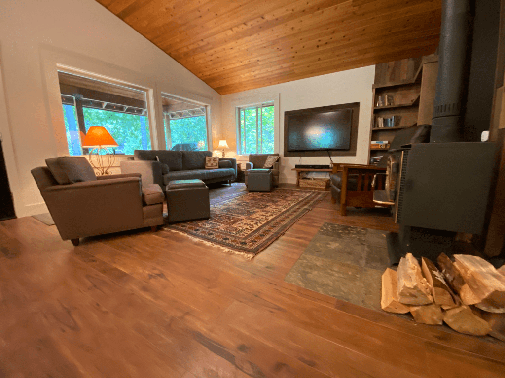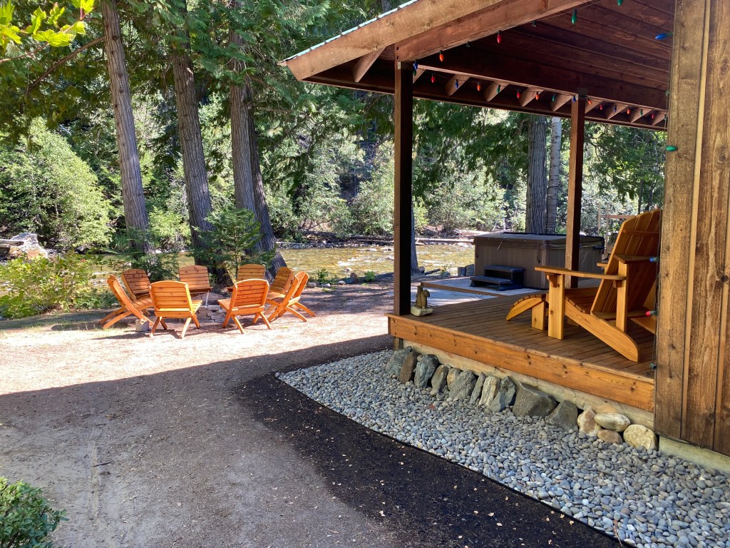 Photos The main cabin as seen from the driveway Kitchen, looking towards dining table Kitchen seen from living room Small bedroom in main cabin, with queen bed Small bathroom in main cabin Master bedroom in main cabin, with queen bed Master bathroom in main cabin Living room in main cabin, with wood burning fireplace, and TV with internet Back porch and yard Hot tub and back yard Fireplace in back yard Bunkhouse seen from river Queen bed in bunkhouse Twin beds in bunkhouse Living room/game space in bunkhouse Like Loading...