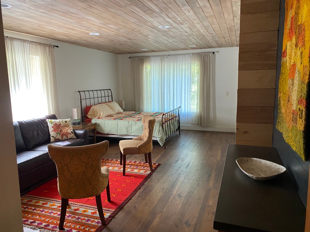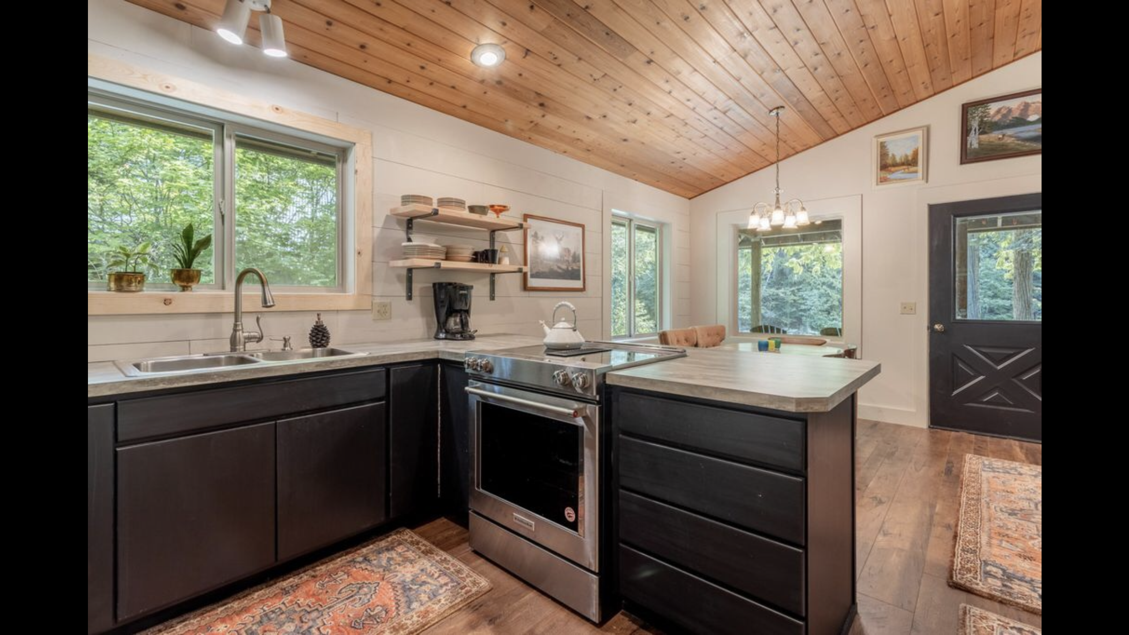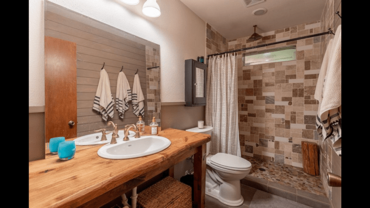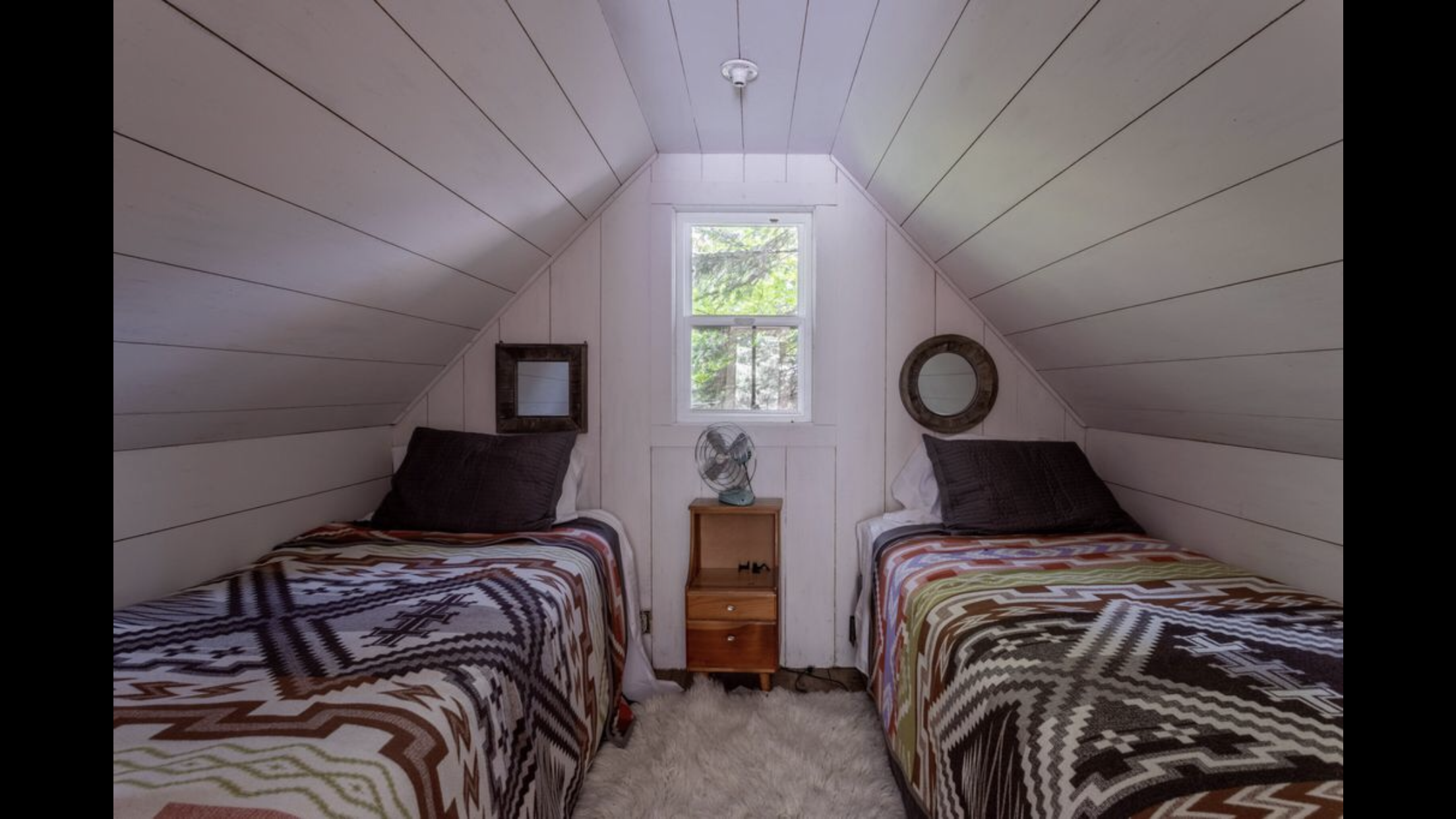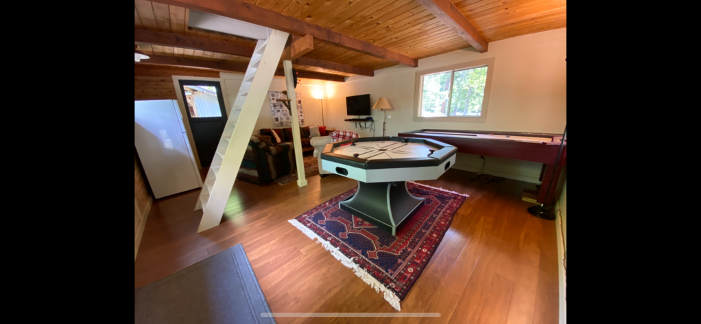 Photos The main cabin as seen from the driveway Kitchen, looking towards dining table Kitchen seen from living room Small bedroom in main cabin, with queen bed Small bathroom in main cabin Master bedroom in main cabin, with queen bed Master bathroom in main cabin Living room in main cabin, with wood burning fireplace, and TV with internet Back porch and yard Hot tub and back yard Fireplace in back yard Bunkhouse seen from river Queen bed in bunkhouse Twin beds in bunkhouse Living room/game space in bunkhouse Like Loading...